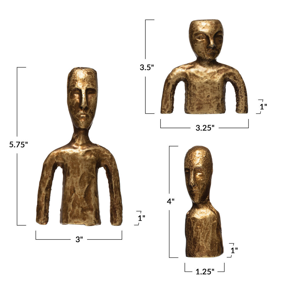 These display pieces are an easy way to accent any unique home. Made out of cast iron, these figures come in 3 styles, each featuring an antique gold finish. These are a beautiful display set for any stylish home, and look great on any shelves