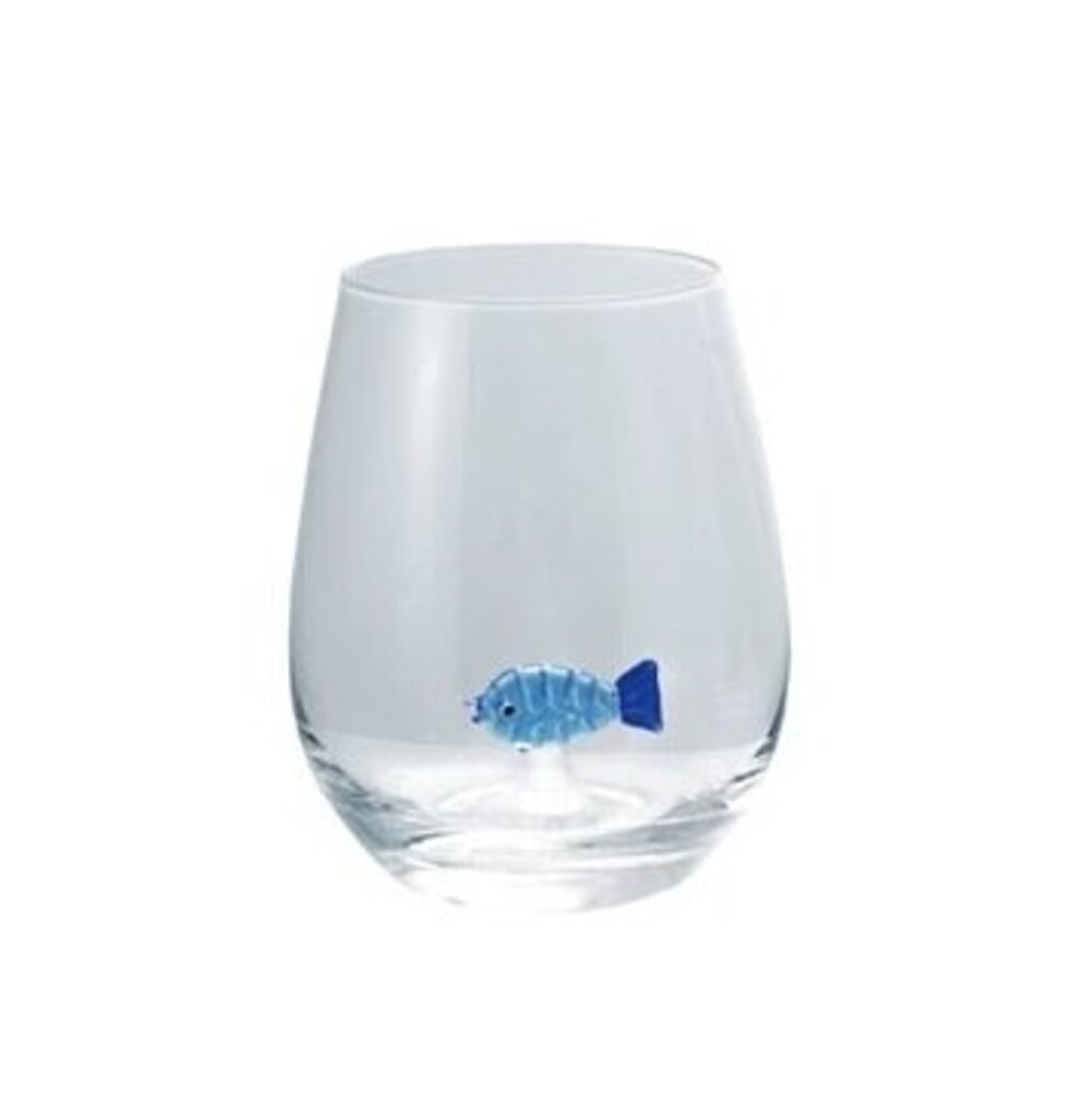 18 oz. Stemless Wine Glass with Hand-Blown 'Blue Fish' Inside - New is backordered and will ship as soon as it is back in stock.