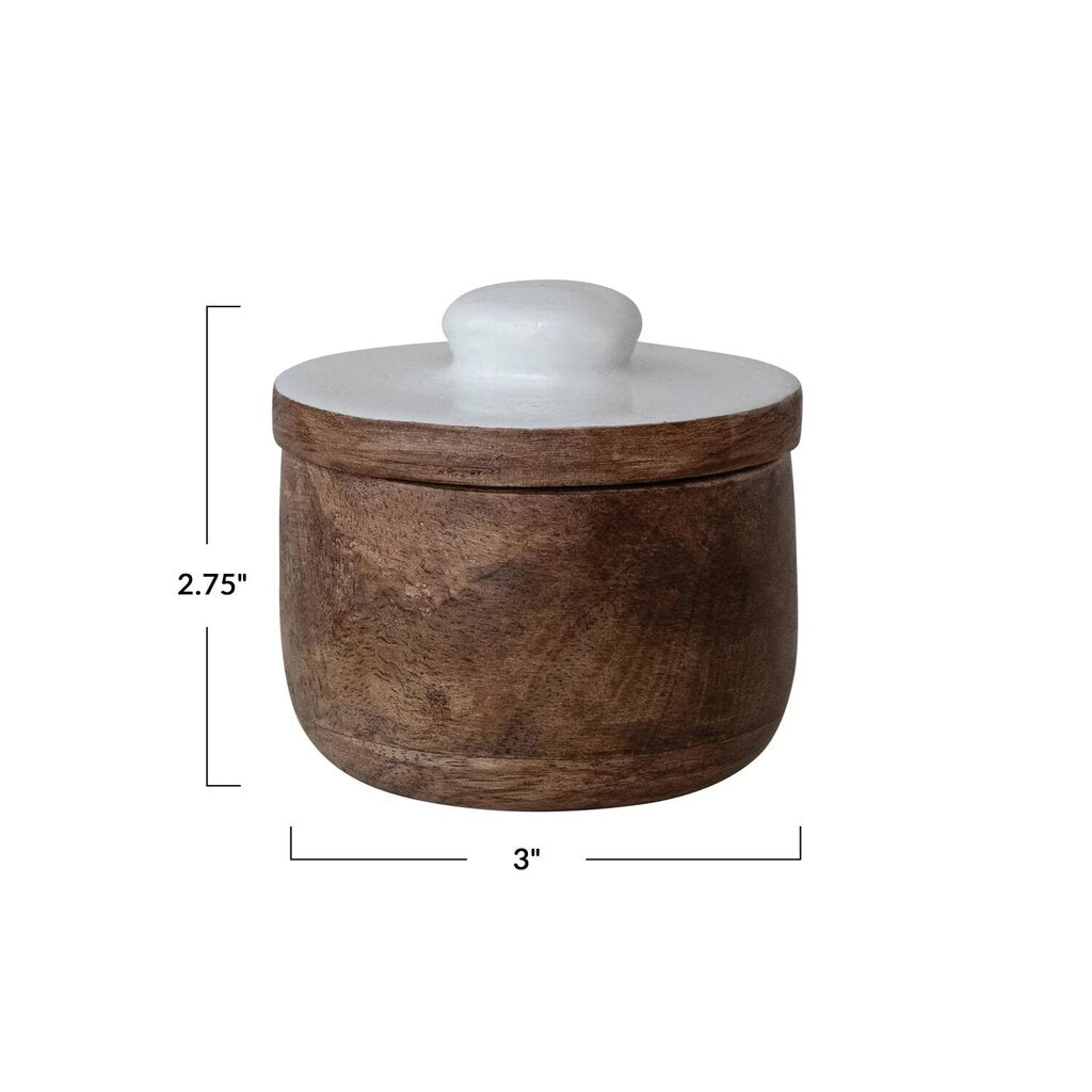 Mango Wood Pinch Pot w/ Enameled Lid, Natural & White - New is backordered and will ship as soon as it is back in stock.