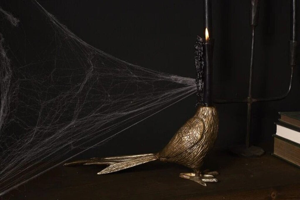 The Pheasant Taper Holder is an antique gold metal sculpture of a pheasant's form that holds a taper candle holder in place of it's head. Eerie and odd, this Halloween candle holder is a Poe-esque addition to a seasonal display.