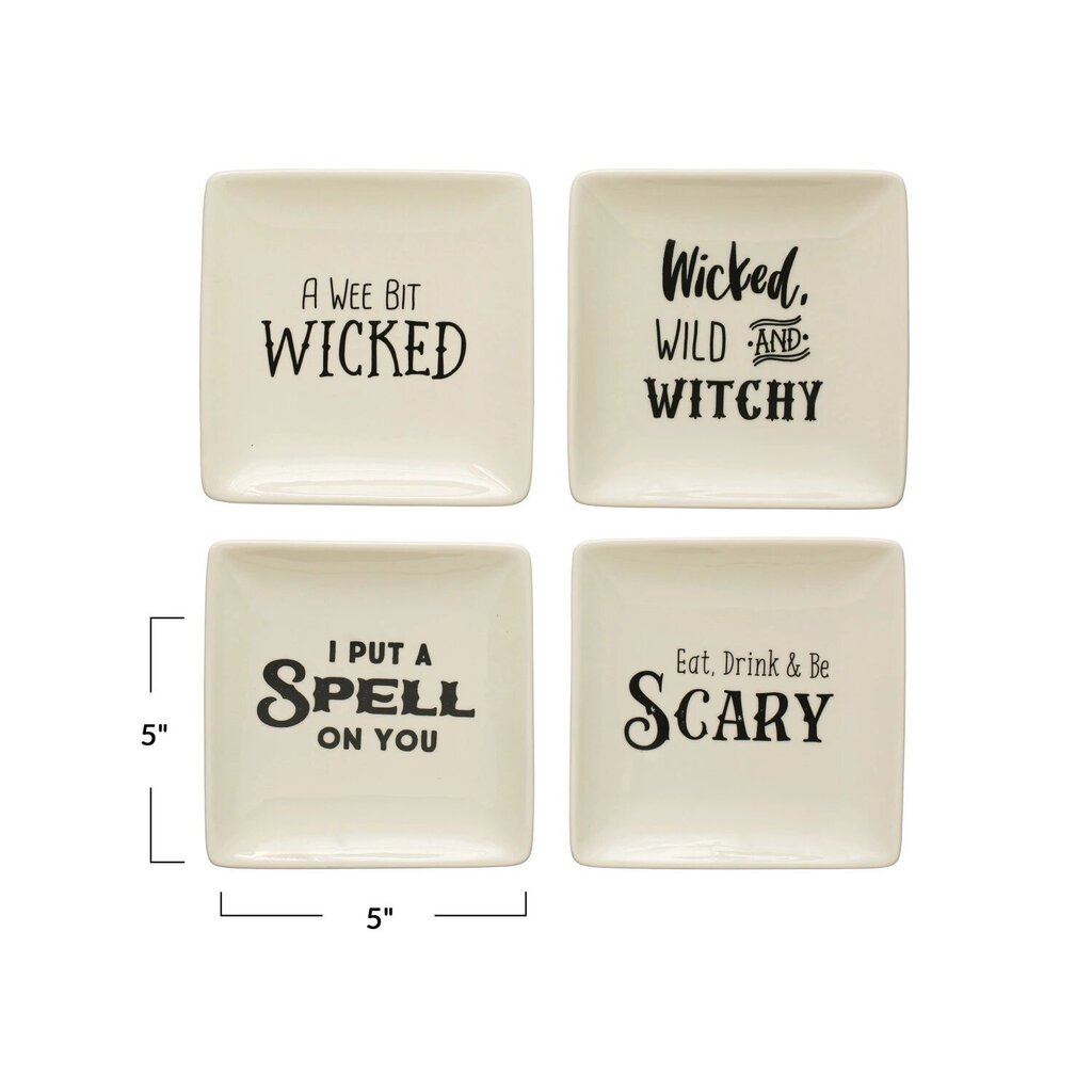 5" Square Stoneware Plate w/ Spooky Saying, Cream Color & Black, 4 Styles available