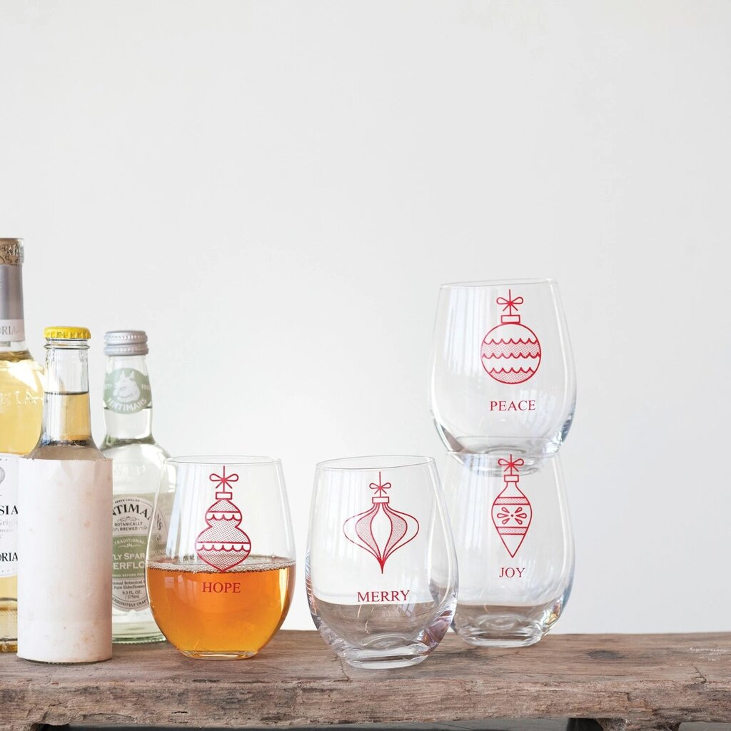 This stemless wine glass with red ornaments and words is a festive and elegant way to celebrate the season. The glass has a round shape and a red and clear color scheme, with each glass featuring a different ornament and word. The glasses come in four styles, each with a different ornament and word. The words include "Peace", "Joy", "Hope", and "Merry". The glasses measure 3.5 inches in diameter and 4.75 inches in height, with a capacity of 18 ounces. Made of pure glass, they are perfect for serving wine, champagne, or other beverages, and make a thoughtful gift for loved ones. A festive wine glass that features an ornament and words in clear and red color, and round shape. A perfect choice for seasonal dining, or a thoughtful gift for loved ones. This festive glass can be used for serving wine, champagne, or other beverages, or as a decorative piece on the table or shelf.