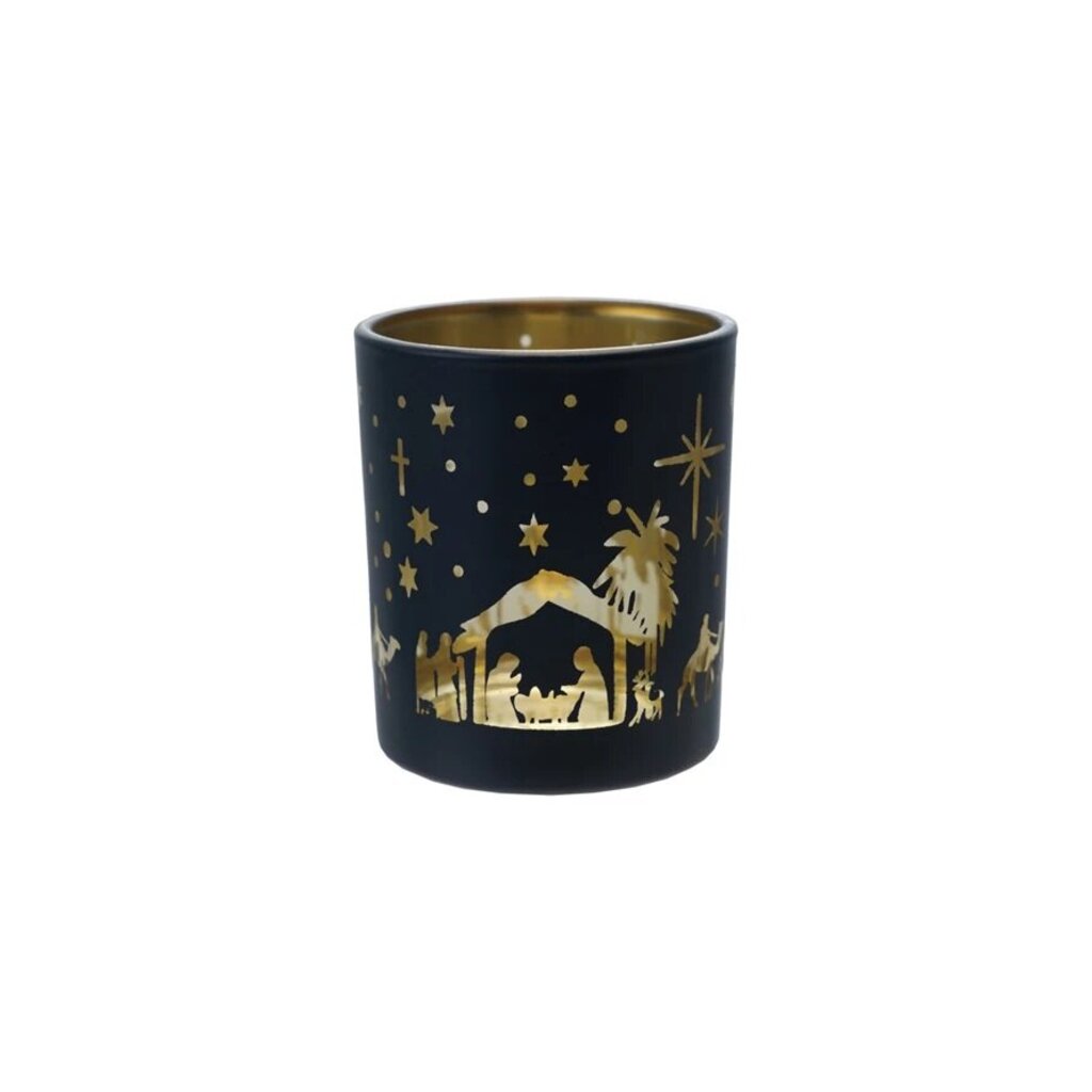 2-3/4" Round x 3"H Glass Tealight/Votive Holder w/ Laser Etched Nativity Scene, Matte Navy Color & Gold Finish