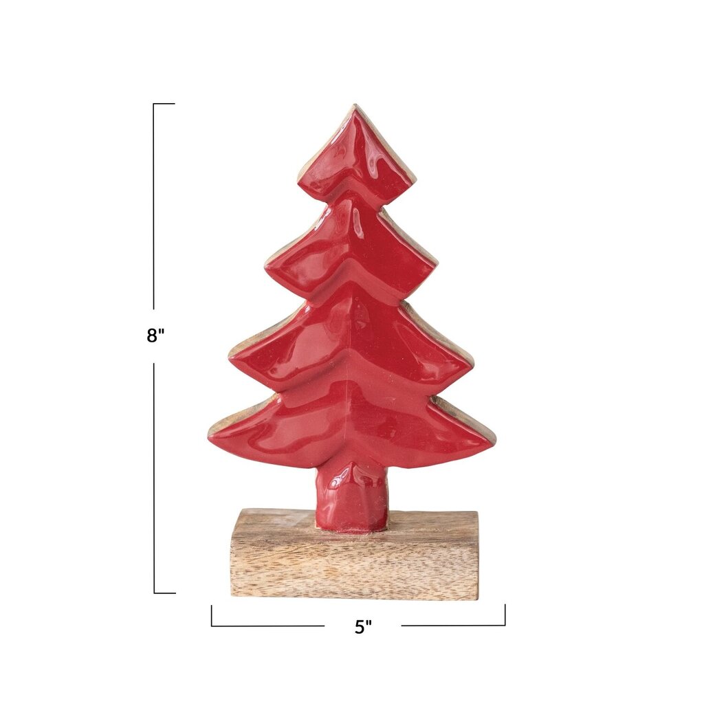 This carved enameled mango wood tree with base is a lovely and elegant way to decorate for the holidays. It features a carved enameled mango wood tree with a base that has a red and natural color scheme and a round shape, creating a festive and eye-catching effect. The tree has a smooth texture that is pleasant to touch and look at. The tree is ideal for displaying on a table, mantel, shelf, or window sill, where it can add a touch of charm and warmth to the space. The tree can also stand on its own or be paired with other trees or ornaments, making it a versatile and customizable option. The tree is made of mango wood that is durable, smooth, and easy to clean, making it a convenient and reusable option. It measures 5 inches in length, 2 inches in width, and 8 inches in height, making it a graceful and noticeable centerpiece. Elevate the holiday decor with this eye-catching Christmas tree, adding both style and a touch of whimsy. A red and natural carved enameled mango wood tree with a base that has a smooth texture and a round shape. A festive and elegant addition to any holiday decor, this tree brings a touch of color and contrast to any room. Ideal for displaying on a table, mantel, shelf, or window sill, this tree can stand on its own or be paired with other trees or ornaments.
