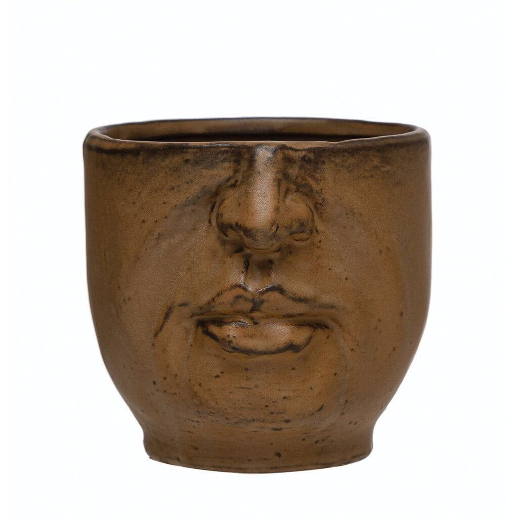Stoneware Planter with Face, Matte Brown