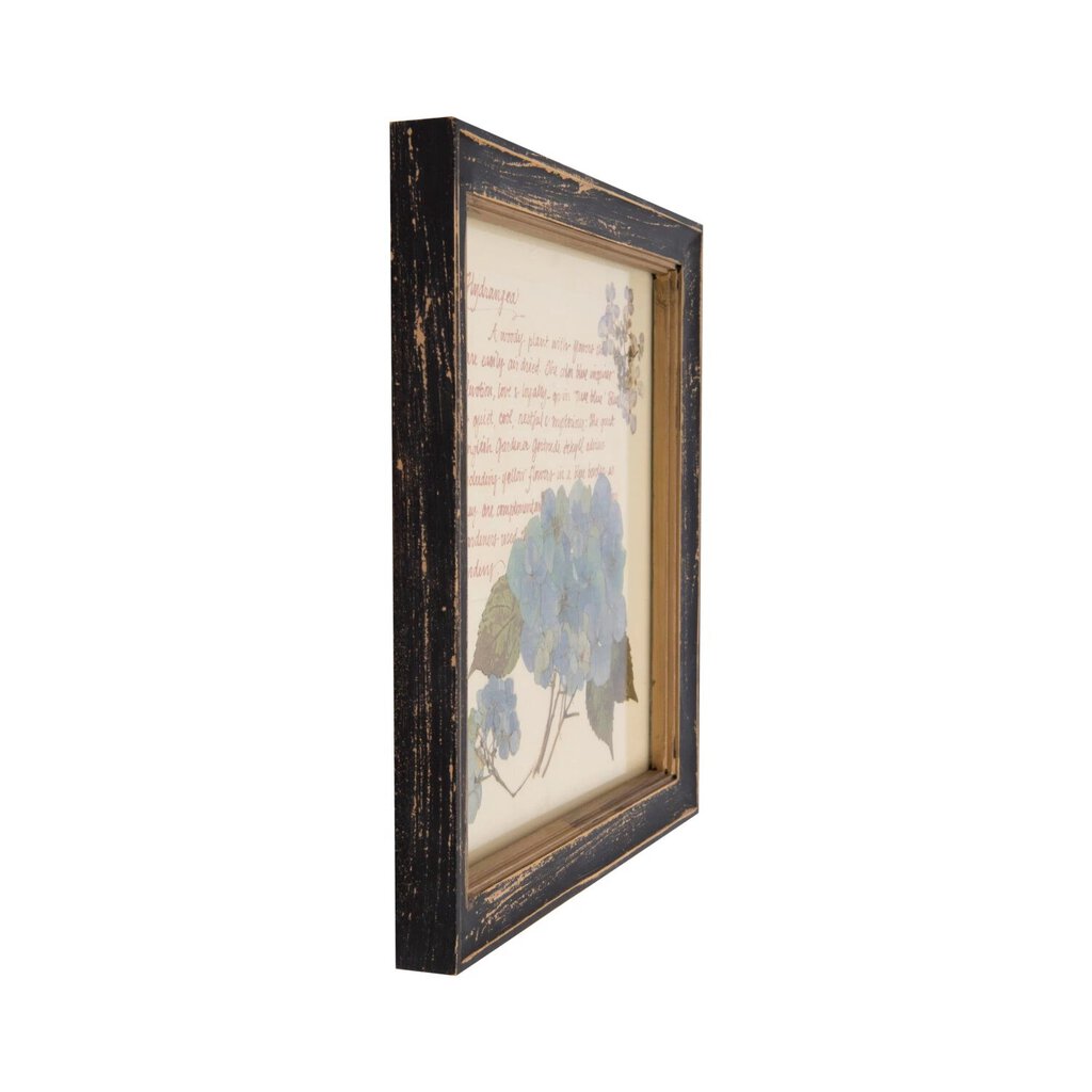 Each of these framed flower prints has an old wives tale or practical information about the featured botanical. The wood frames come in an extremely distressed black finish. Perfect hanging together in a grouping or in different locations around your store. Comes in 6 styles. Species of flowers featured: Buttercup, Bachelor's Button, Hydrangea, Pansies, Violet, Queen Anne's Lace.  Price is for (1) Framed wall art
